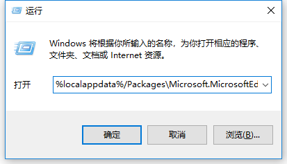 2、根据上图提示,我们将下面的代码:%localappdata%/PackagesMicrosoft.MicrosoftEdge_8wekyb3d8bbweACMicrosoftEdgeUser复制粘贴至运行窗口中,如下图所示:
